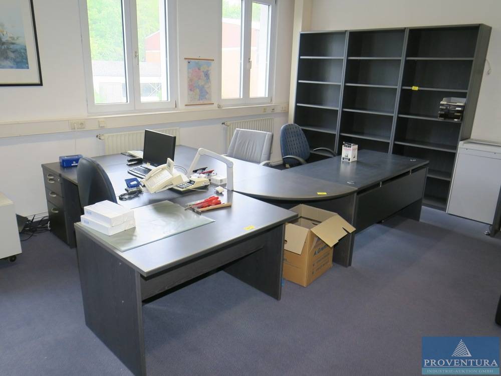 Büromöblierung anthrazit, Winkelschreibtisch ca. 200x200 cm, 6 Aktenregale je ca. 80x220h cm, 4 Schiebetüren-Sideboards je ca. 120x115h cm, 1 Schreibtisch ca. 180b cm, 1 Schreibtisch m. Tischaufsatz ca. 160b cm, Drehstühle etc.
