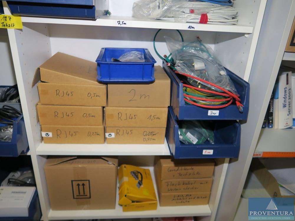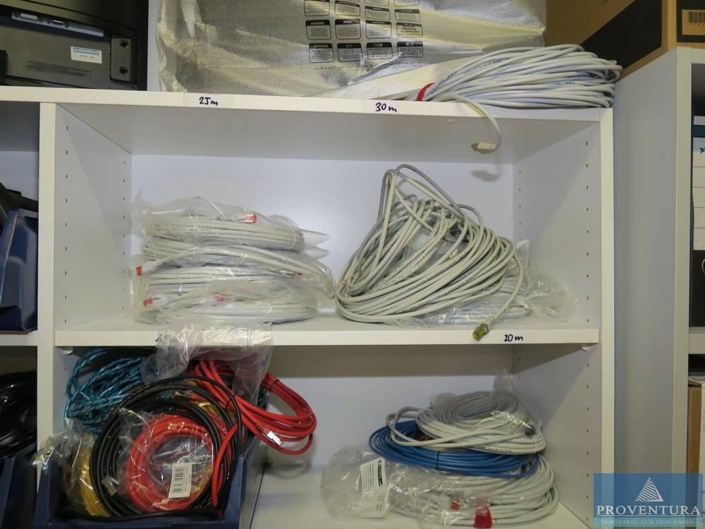 EDV-Zubehör: div. Netzwerkkabel, Tastaturen, Mäuse, Monitorkabel, Mehrfachsteckdosen, 3 Monitore, alte Grafikkarten etc., verteilt hier in den Regalen