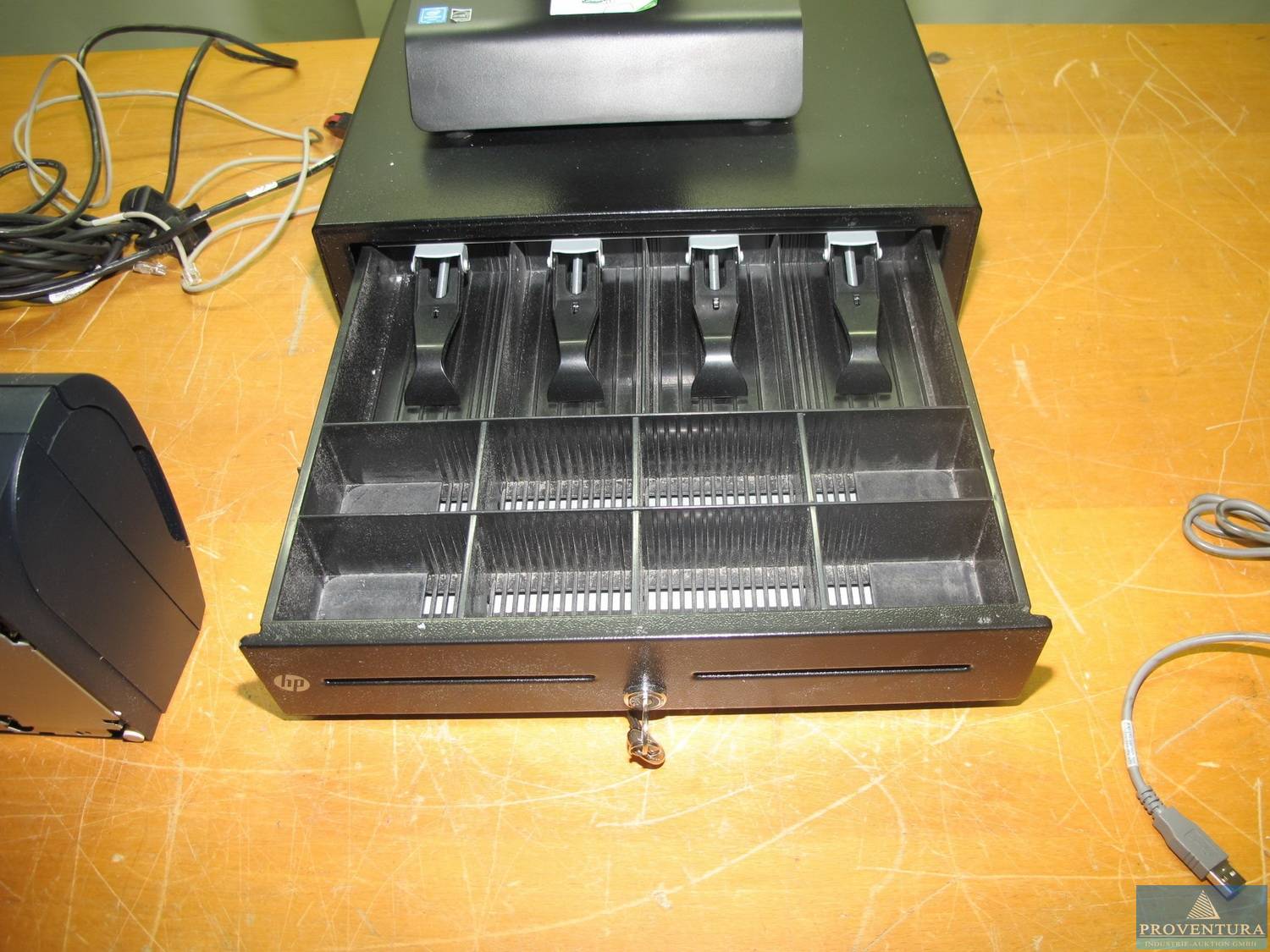 PC-System aus ehemaligen Kassenarbeitsplatz HP RP2 Retail System Model 2030, S/N CZC636B350, INTEL Pentium J2900, 4 GB RAM, 120 GB SSD, ohne Software, Nicht zur Verwendung im Sinne des § 146 AO geeignet und/oder bestimmt, Bondrucker HP A798-C20D-HP20, mit Netzteil und Verbindungskabel, Barcodescanner Z-3220, 1x Kassenlade HP mit Schlüsseln