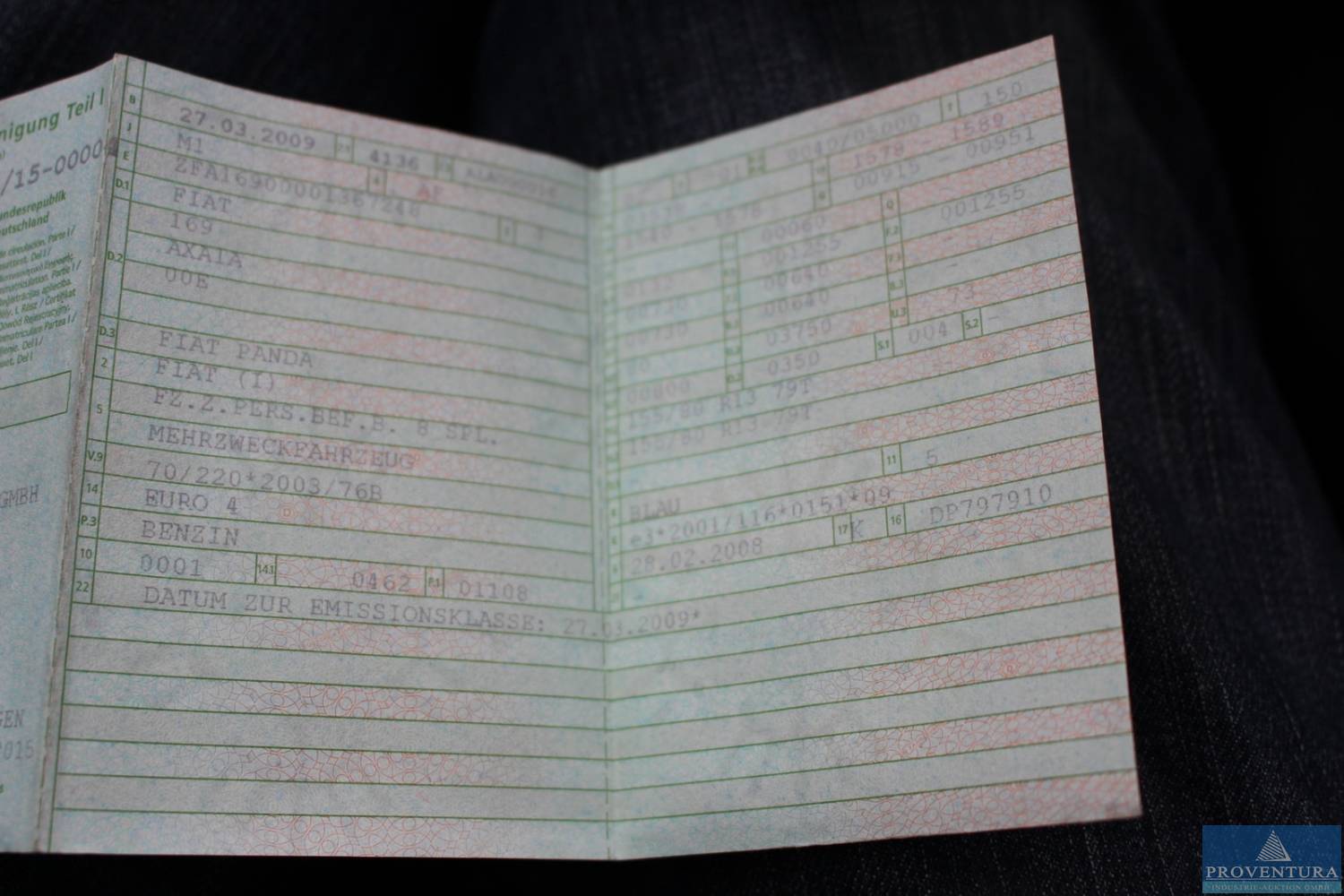 Mehrzweckfahrzeug FIAT Panda 1.1, EZ 27.03.09, 83.501 abgel. km (27.02.23), 83.091 abgel. km (05.12.22), 1.108 cm³ Otto, 40 kW, FIN ZFA16900001367248, Euro 4, 5-Gang-Schaltung, 2 Schlüssel, Serviceheft fehlt, HU-Bescheinigung fehlt (im Kfz-Schein eingetragen), HU 06/24