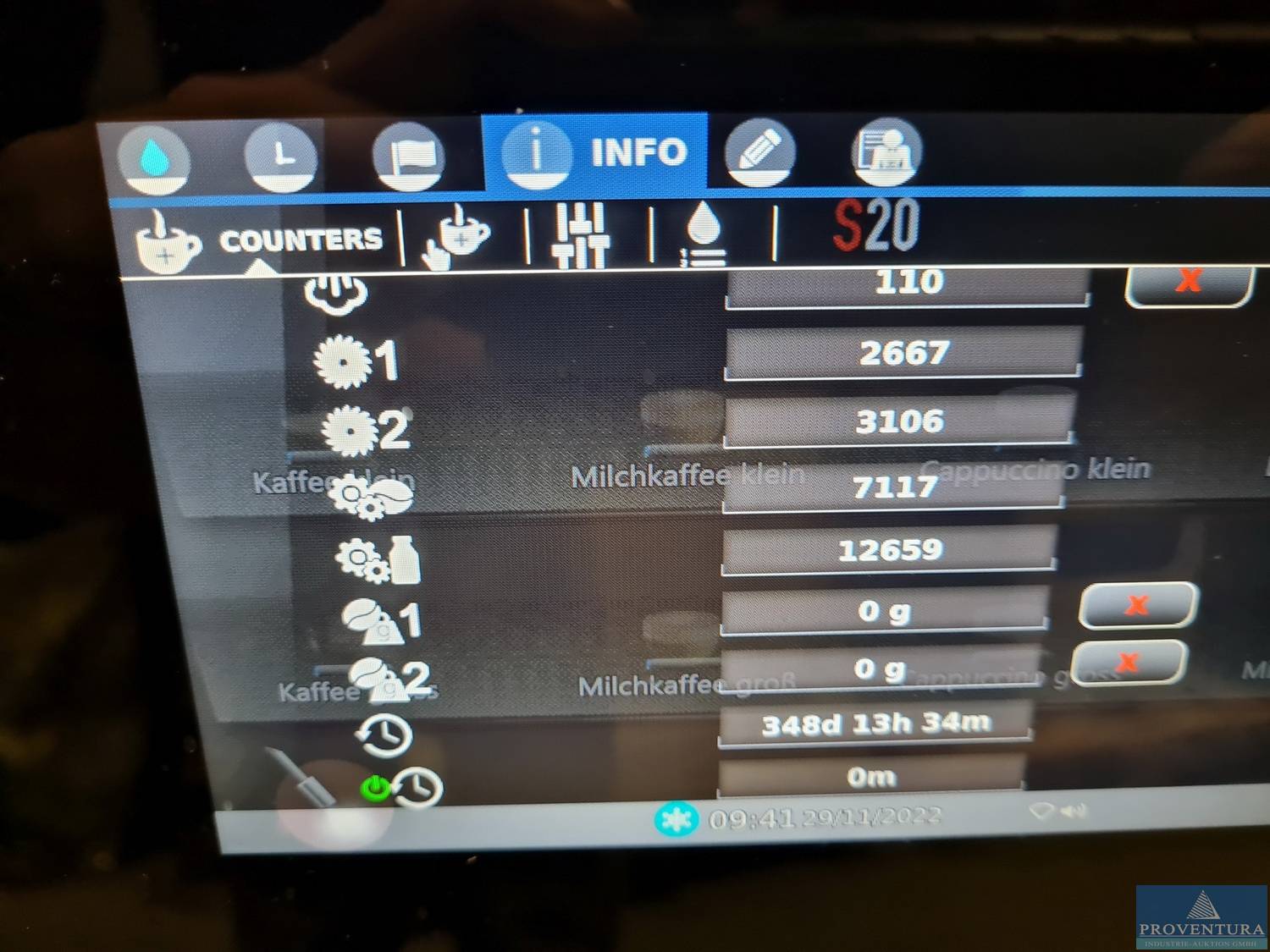 Kaffeevollautomat LA CIMBALI S20 CP10, S/N 1853940, 2 Mühlen, Abmessung ca. 370 mm breit x ca 620 mm tief x ca. 762 mm hoch, Festwasseranschluss, angeschafft 06.2020 für ca. 7.680 € netto, Durchsatz Kaffee 7.117 Tassen , Durchsatz Milch, 12.659. Die Ausgabe erfolgt an der LKW Laderampe, Gustav-Bielefeld-Straße 2,Achtung: Laderampenhöhe ca. 1,10m! Fahrzeug mit Hebebühne (LKW) oder "Sprinter" mit Hubwagen oder Rampen erforderlich (Bei einem anderen Fahrzeug benötigen Sie genug kräftige Personen zum Herunterheben der Ware),