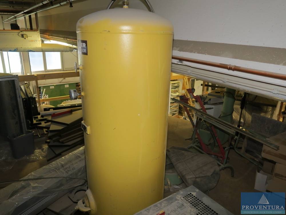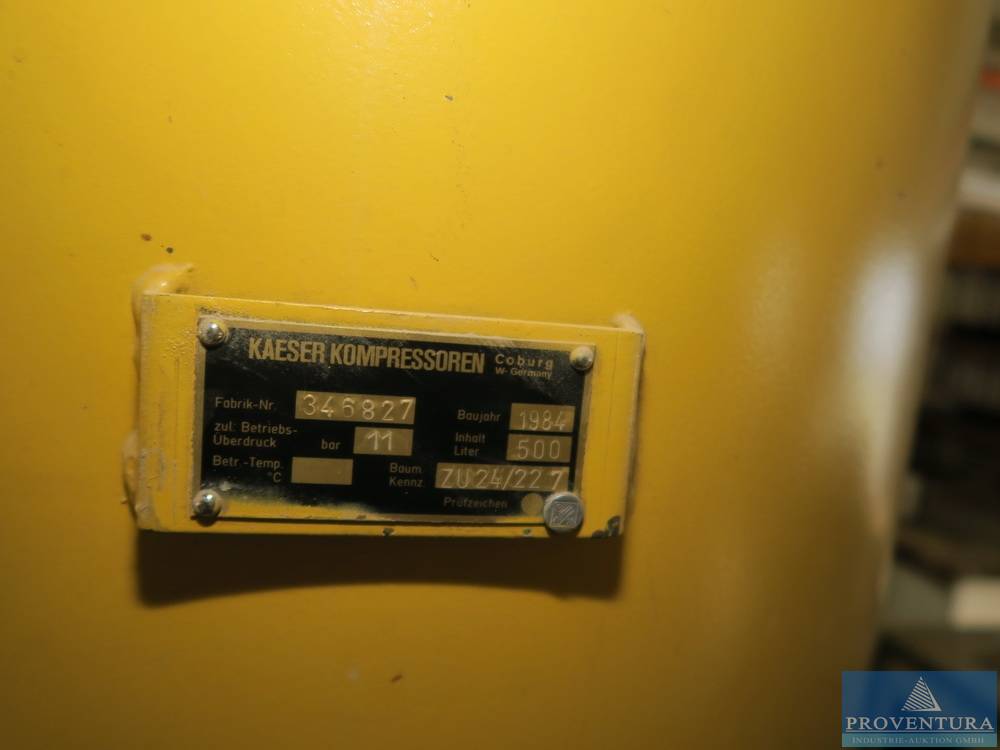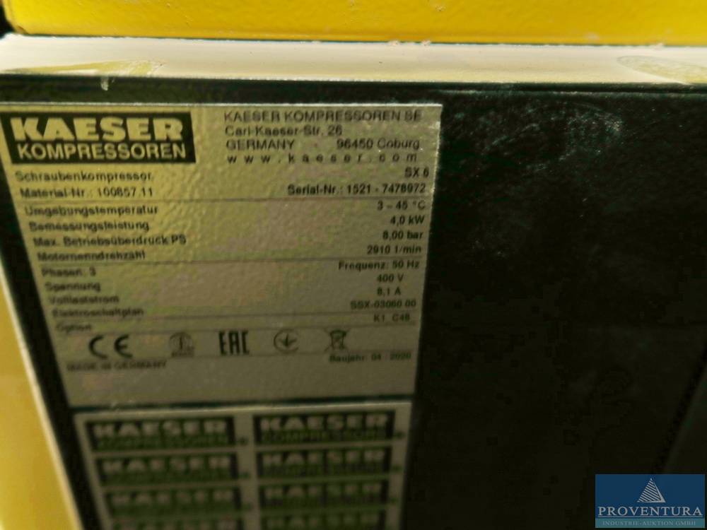 Kompressoranlage KAESER Bj. 2020, Schraubenkompressor SX6 Sigma, 4.0 kW, max. 8 bar, 1.370 abgel. B/h (16.01.23), Laststunden 875, Wartung in 306 Stunden, S/N 15217478972, Kältetrockner KAESER TB 19, Bj. 2003, Kältemittel R134a, S/N 1398, Druckbehälter KAESER 500 l, Bj. 1984, max. 11 bar, steht auf einer Empore unter dem Dach