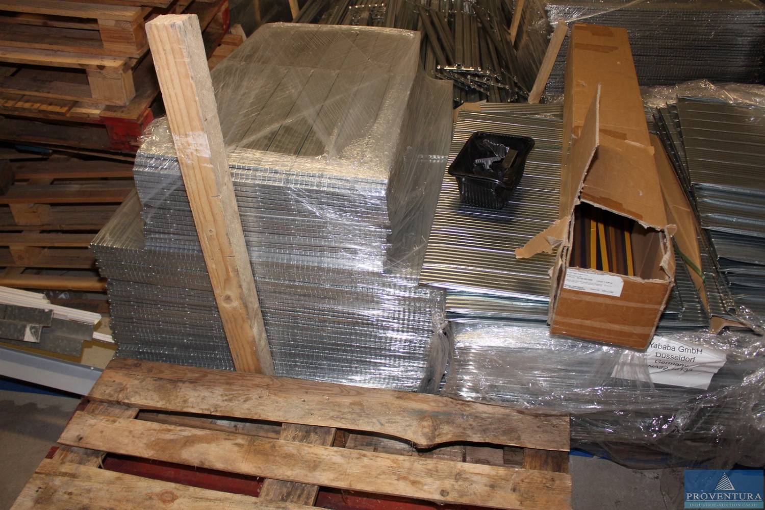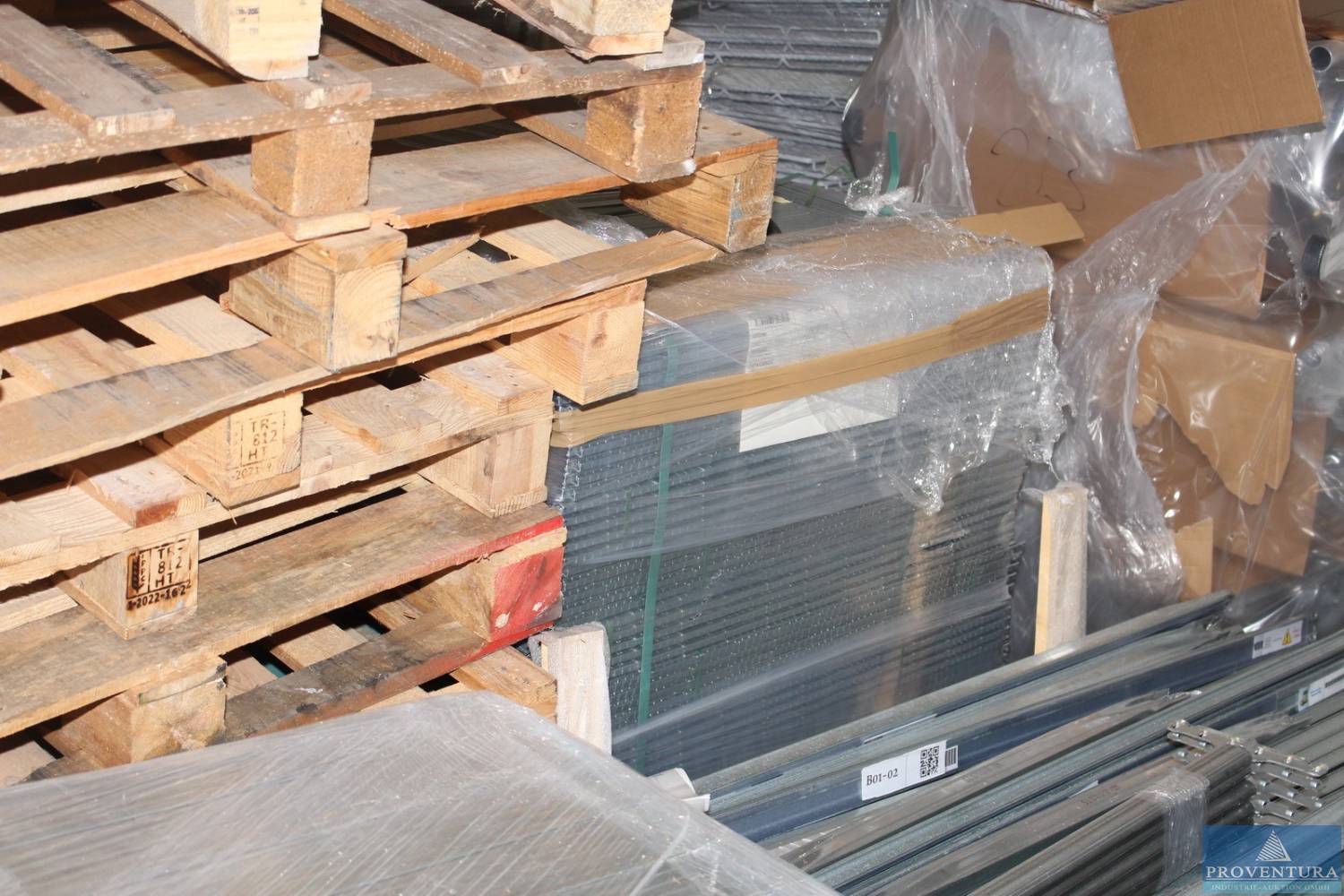 Steckregalteile verzinkt Made in Italy zerlegt gesamt ca. 4 Ständer je ca. 200x60 cm, ca. 200 Böden je ca. 50x60 cm, ca. 240 Böden je ca. 90x60 cm, Fachlast 130 kg, 1 Palette Traversen, gesamt ca. 11 Paletten