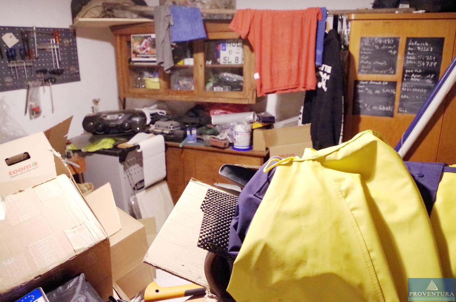 Tischlerhobelbank, 1 Anrichte, sämtliches Werkzeug, 1 Ghettoblaster PHILIPS Funktionsfähigkeit nicht bekannt, 1 Werkstattwagen VIBOR, Inhalt nicht einsehbar weil nicht zugänglich, 1 Vertiko, Inhalt ebenfalls nicht bekannt, 1 Schrank, Inhalt nicht einsehbar, dazu 1 Monitor, Funktionsfähigkeit nicht bekannt, 1 Leiter, 1 Mini Bandsäge AL-KO mit Bandsägentisch, 1 Metallkoffer, vereinzelte Herrenbekleidung, kleine Werkzeugkästen, komplett, Inhalt siehe Abbildung, inkl. Seilzug für Motorrad an der Decke, ohne Kettensäge Stihl