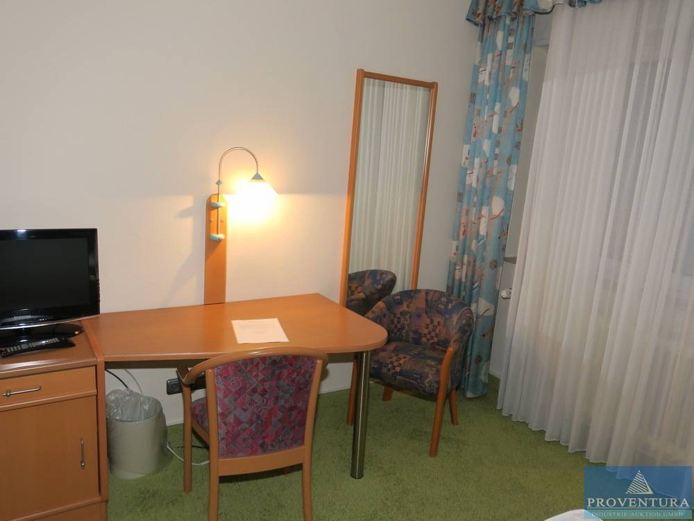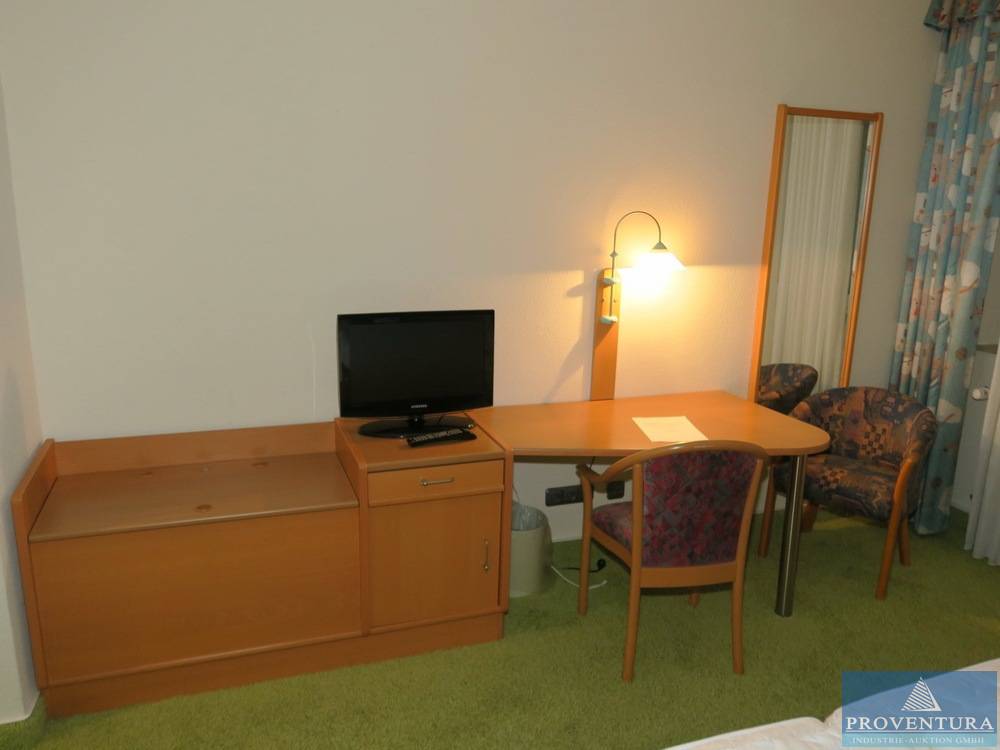 Doppelbett-Hotelzimmereinrichtung Holzdekor dunkel, Doppelbett ca. 160x200 cm, Kopfteil m. Nachttischen, Beleuchtung, Schreibtisch u. Sideboard ca. 266b cm, 2 Stühle, Wandspiegel, Fernseher SAMSUNG, Duschhocker, Haartrockner, kleiner Mülleimer