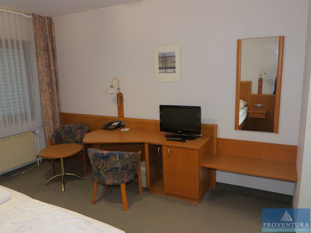 Doppelbett-Hotelzimmereinrichtung Holzdekor dunkel, 2 Einzelbetten je 80x200 cm, Kopfteil m. Nachttischen, Beleuchtung, Schreibtisch u. Sideboard ca. 266b cm, 2 Sessel, Wandspiegel, Beistelltisch, Fernseher SAMSUNG, Duschhocker, Haartrockner, kleiner Mülleimer, Möbeltresor