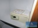Doppelbett-Hotelzimmereinrichtung Holzdekor dunkel, 2 Einzelbetten je 80x200 cm, Kopfteil m. Nachttischen, Beleuchtung, Schreibtisch u. Sideboard ca. 266b cm, 2 Stühle, Beistelltisch, Wandspiegel, Fernseher SAMSUNG, Duschhocker, Haartrockner, kleiner Mülleimer, Möbeltresor