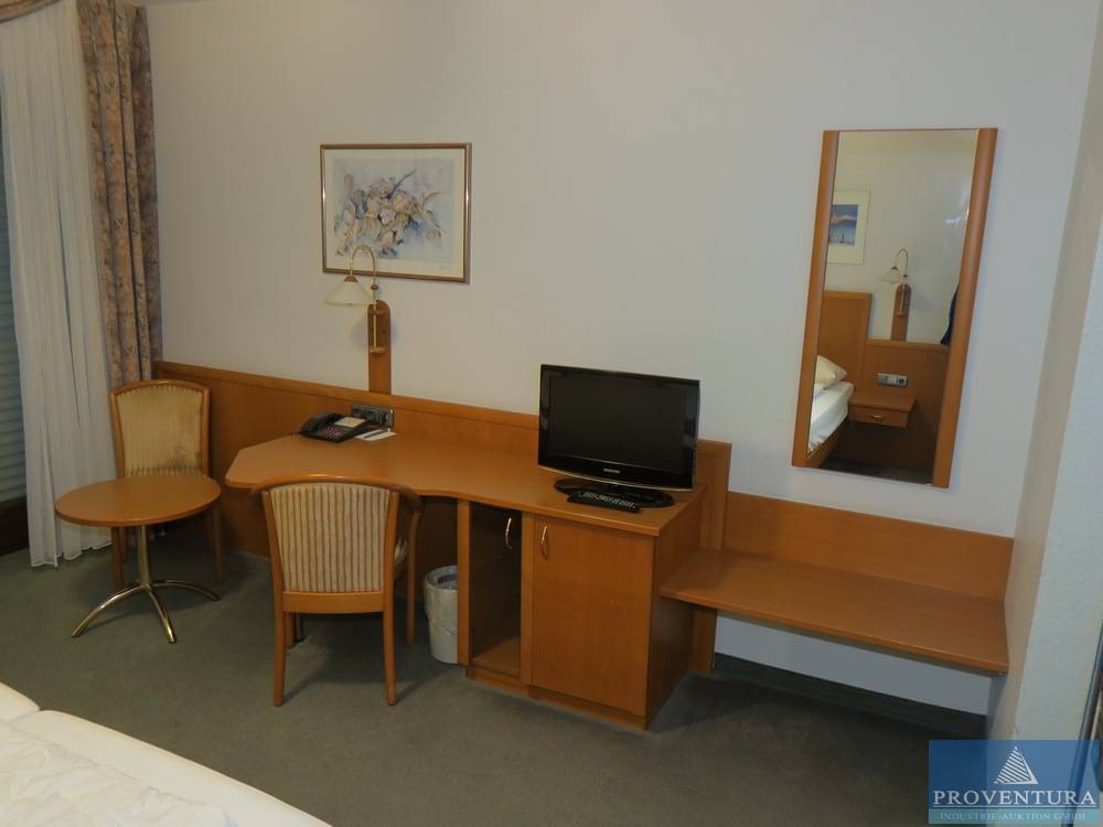 Doppelbett-Hotelzimmereinrichtung Holzdekor dunkel, 2 Einzelbetten je 80x200 cm, Kopfteil m. Nachttischen, Beleuchtung, Schreibtisch u. Sideboard ca. 266b cm, 2 Stühle, Beistelltisch, Wandspiegel, Fernseher SAMSUNG, Duschhocker, Haartrockner, kleiner Mülleimer, Möbeltresor