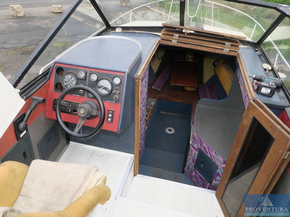 Kajütboot CORONET 21 mit Trailer, Bj. ca. 70er Jahre, Länge ca. 21 Fuß, keine Baunummer vorgefunden, Motor Volvo Penta DuoProp 570 5.7 l V8, Bj. ca. 1989, S/N 4100116124, das Boot wurde vom Auftraggeber mitte der 80er Jahre erworben, dieser hat div. Umbauten vorgenommen, der Motor wurde Anfang der 90er Jahre eingebaut, seit Mitte der 80er Jahre war das Boot nicht mehr im Wasser, Motor läuft (Video), die Badeplattform und der Gerätebügel wurde nachgerüstet, Innenraum und Elektrik unvollständig, dazu Boot-Trailer TPV BTC EZ 17.03.2016, zul. GG 3.500 kg, Tandemachser, Fg.-Nr. ZY2BTCAAA16000612, Seilwinde Knott, HU 03/25, es gibt keine Papiere für das Boot