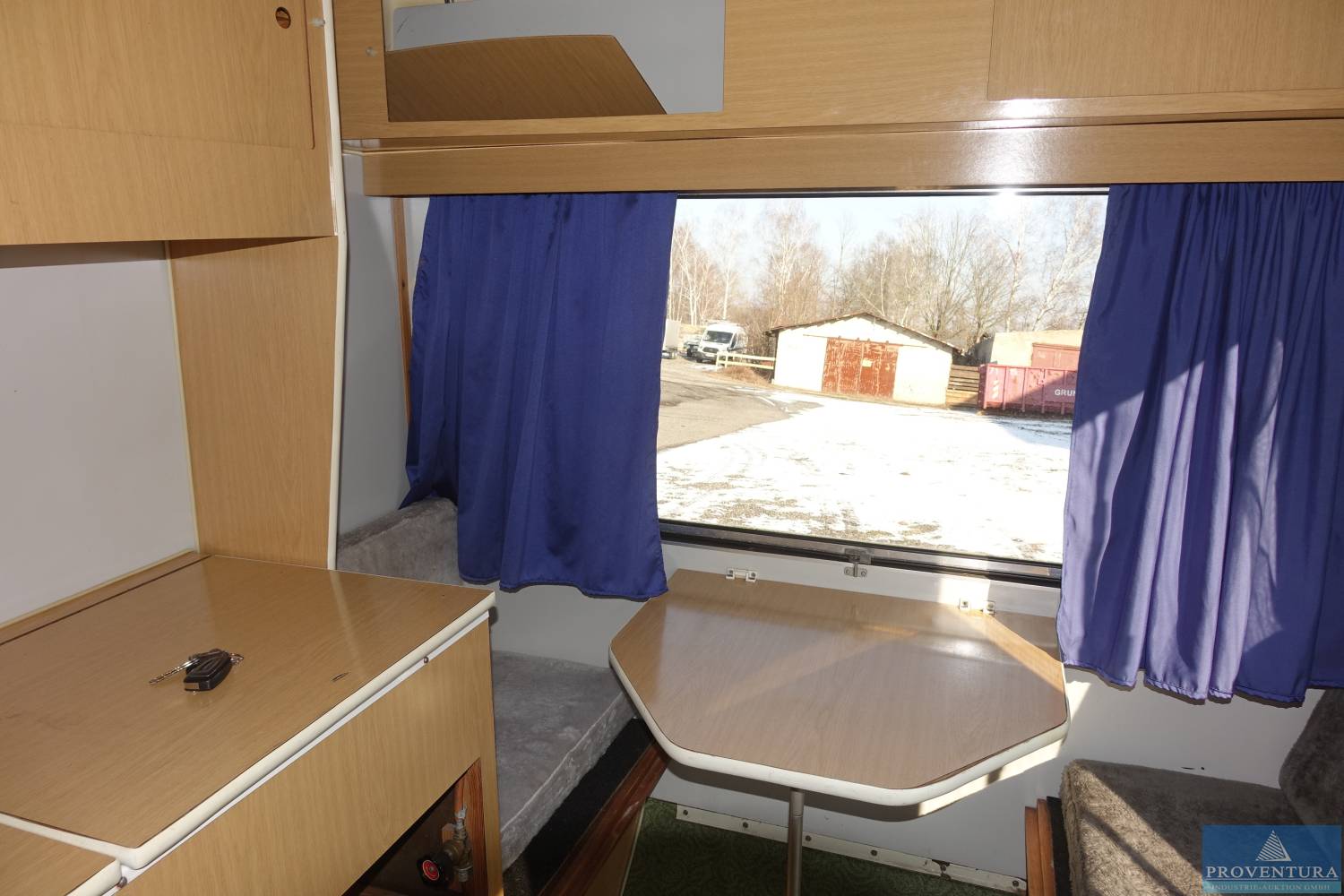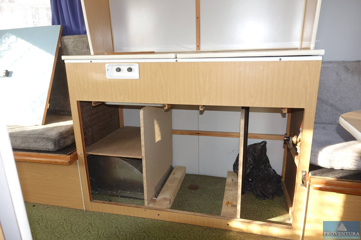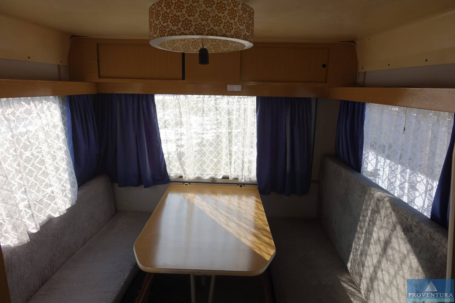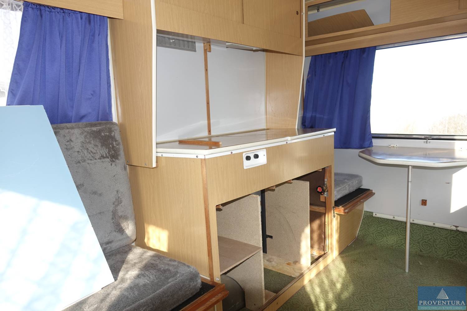 Wohnwagen IFA-Karosseriewerke Bastei HP-701.83, EZ 03.02.1978, zul. GG 700 kg, Fg.-Nr. 9116, Außenfarbe blau/weiß, Sitzgruppe mit Tisch in Front und Heck, Schlafbereich nach Umbau der Sitzgruppe in Front, Stoffausstattung, Kombiküche mit 2- Flammengaskocher und Spüle (fehlende Türen), Ausstellfenster in Front und Heck, Lüftungsklappe im Dach, Kleiderschrank, Gardinen und Vorhänge, optisch keine Feuchtigkeit oder Schimmel, 4 Vorbesitzer, M&S Reifen, 4 Kurbelstützen, alters- und nutzungsbedingter Verschleiß, ZB I und II vorhanden, Original Bedienungsanleitung, Typenplakette und Fahrgestellnummer nicht vorgefunden!, abgemeldet 02/23, HU 06/22